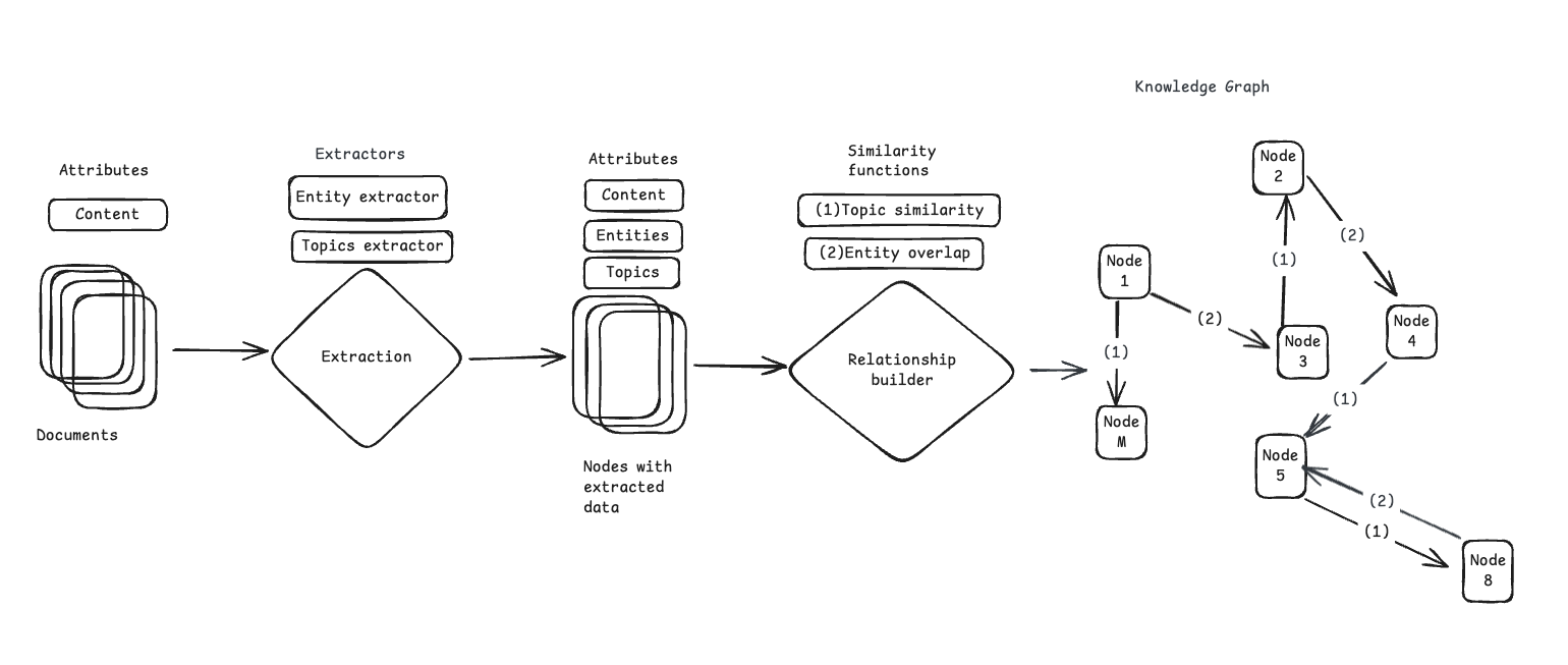 Different extractors are used to extract information from each node that can be used to establish the relationship between the nodes. For example, in the case of financial documents, the extractor that can be used are entity extractor to extract the entities like Company Name, Keyphrase extractor to extract important key phrases present in each node, etc. You can write your own custom extractors to extract the information that is relevant to your domain.