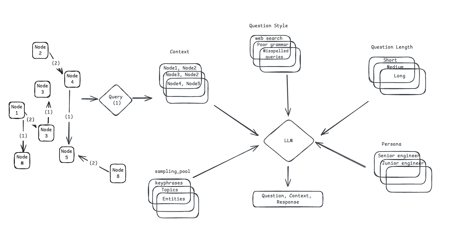 Now we have the knowledge graph that can be used to manufacture the right context to generate any type of query. When a population of users interact with RAG system, they may formulate the queries in various ways depending upon their persona (eg, Senior Engineer, Junior Engineer, etc), Query length (Short, Long, etc), Query style (Formal, Informal, etc). To generate the queries that cover all these scenarios, Ragas uses a Scenario based approach to Test set Generation.